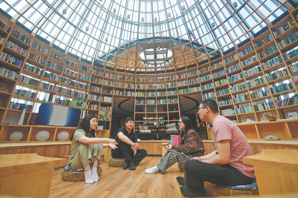 Visitors chat at a rural bookstore at Weichang Manchu and Mongolian autonomous county in Hebei province in early June. [Photo/Xinhua]