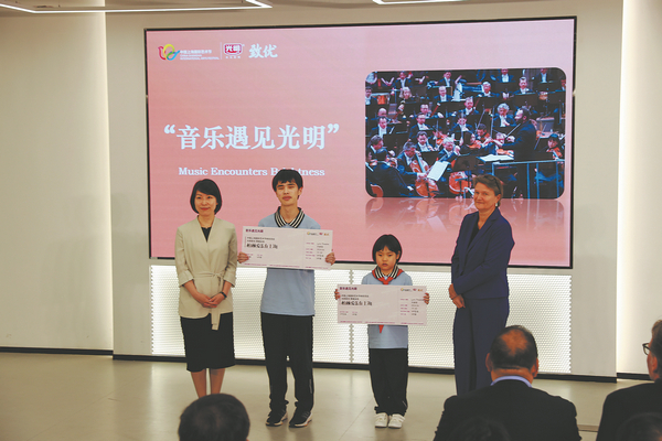 Andrea Zietzschmann (right), general manager of Berliner Philharmoniker Foundation, gives free tickets to two visually impaired children on Monday. CHINA DAILY